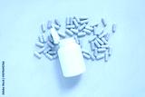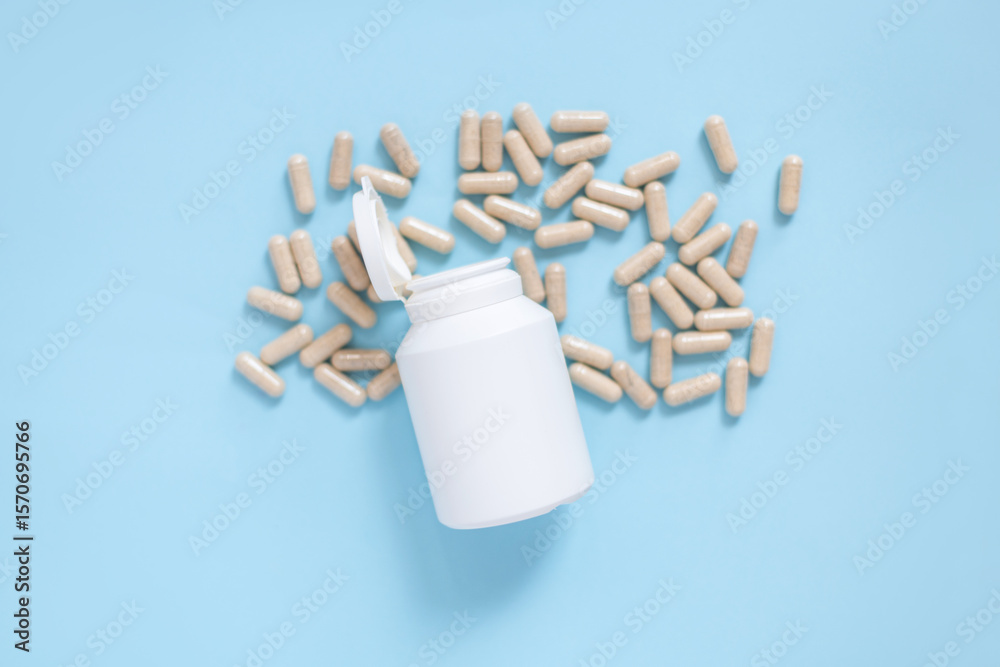 Open white bottle with natural supplement capsules scattered on pastel blue background. Health, wellness, and nutrition concept with copy space.