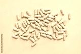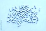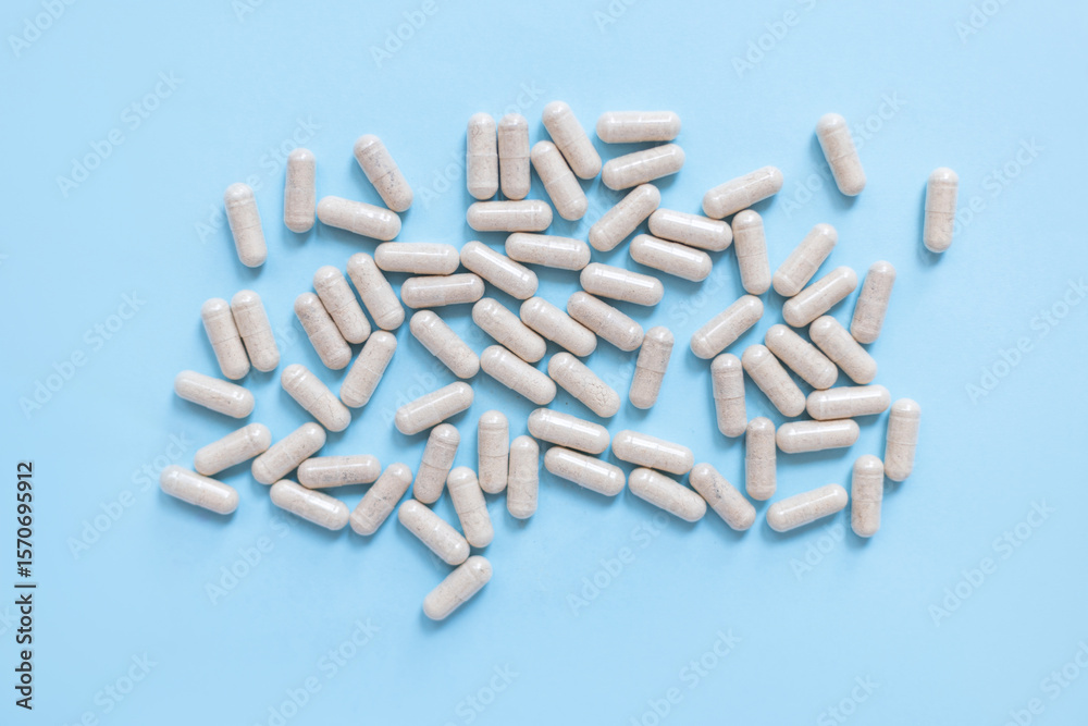Flat lay of herbal capsules and bottle on blue background. Concept of alternative medicine, vitamins, nutrition, and healthcare products.
