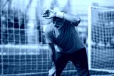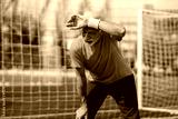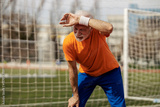 Tired old athlete is standing on stadium and wiping sweat from forehead.