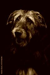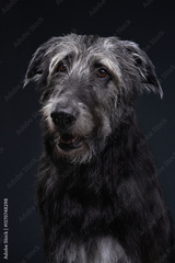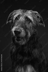 A close-up portrait of a Scottish Deerhound, its eyes full of expression. The soft lighting brings out the texture of its wiry fur against a dramatic dark background.