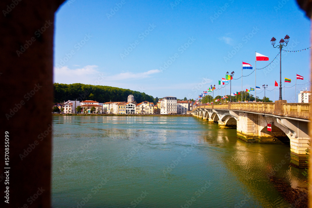 Widok na kamienny most i panoramę miasta, Pireneje Atlantyckie, Bayonne, Francja, View of the stone bridge and the city skyline, Pyrenees-Atlantiques, Bayonne, France