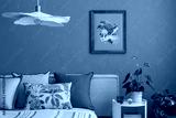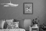 Contemporary bedroom with plant decor, elegant lighting, bed styled with green and beige cushions, plants and personal accessories. Mock poster above the bed.