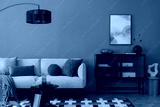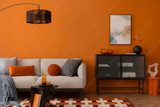 Contemporary interior with orange tones, a black sideboard and a grey sofa adorned with textured cushions. Modern retro style.