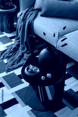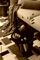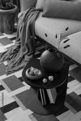 Close-up of black coffee table, cozy decor with soft blanket, round vase and wooden bowl on patterned rug.