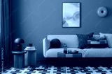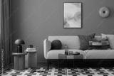 Stylish interior with mock up abstract wall art, plaid cushion and playful orange wall lamp.