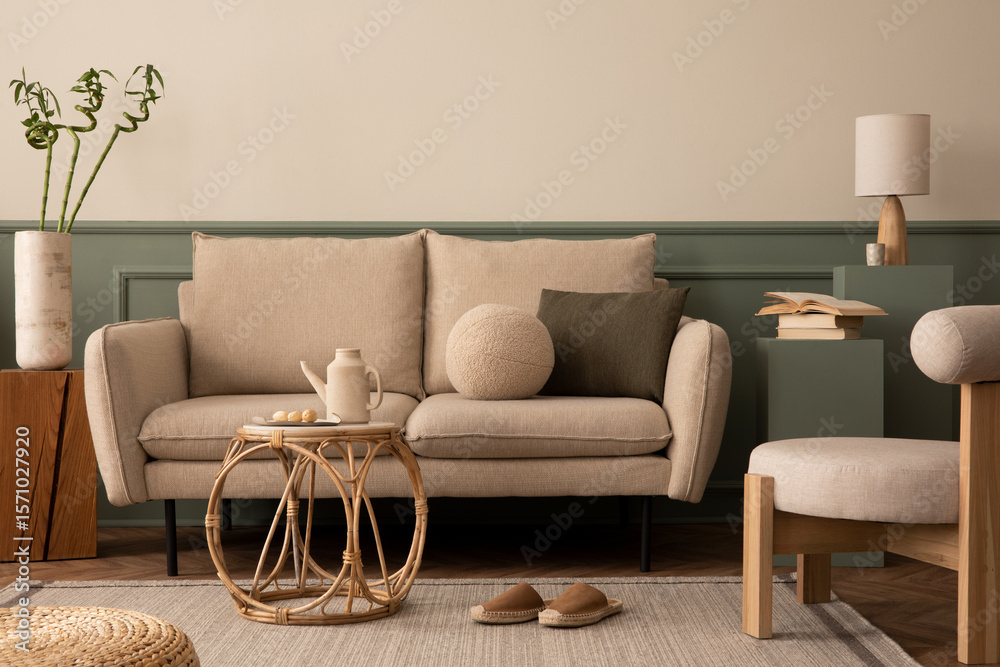 Stylish composition of living room interior with beige sofa, wooden sideboard, stylish armchair, green wall with stucco, brown pillow, slippers, carpet and personal accessories. Home decor. Template.
