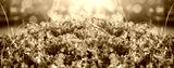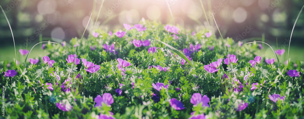 Beautiful violet bells flowers, greens and bokeh lighting in the garden, summer outdoor floral nature background. Landscape