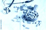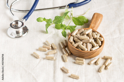 Herbal capsules from herbs on wooden table
