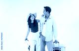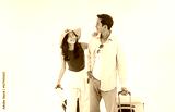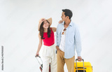 Holidays journey asian couple traveller walking with travel luggage on isolated white background