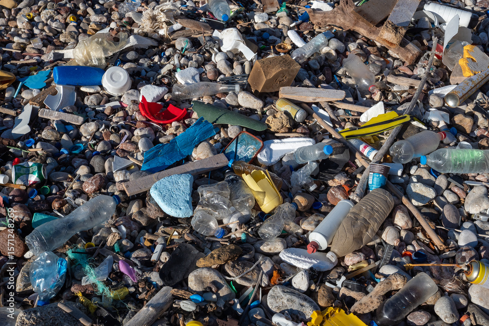 Plastic bottles and garbage polluting a pebble beach
