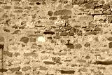 Stone antique old wall as a background or texture. Vintage background of a fortress wall in loft and grunge style with place for text and copy space.