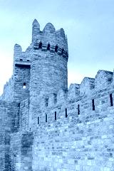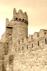 Ancient stone fortress walls featuring a textured round tower under a blue sky