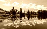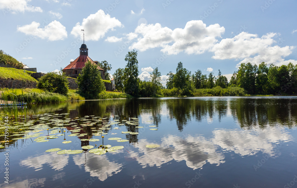 Korela Fortress placed at the lake coast. Summer landscape photography