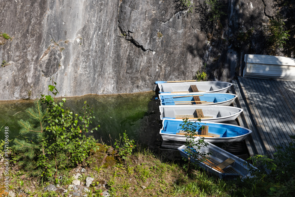 Blue white rowboats for rent are at rocky coast