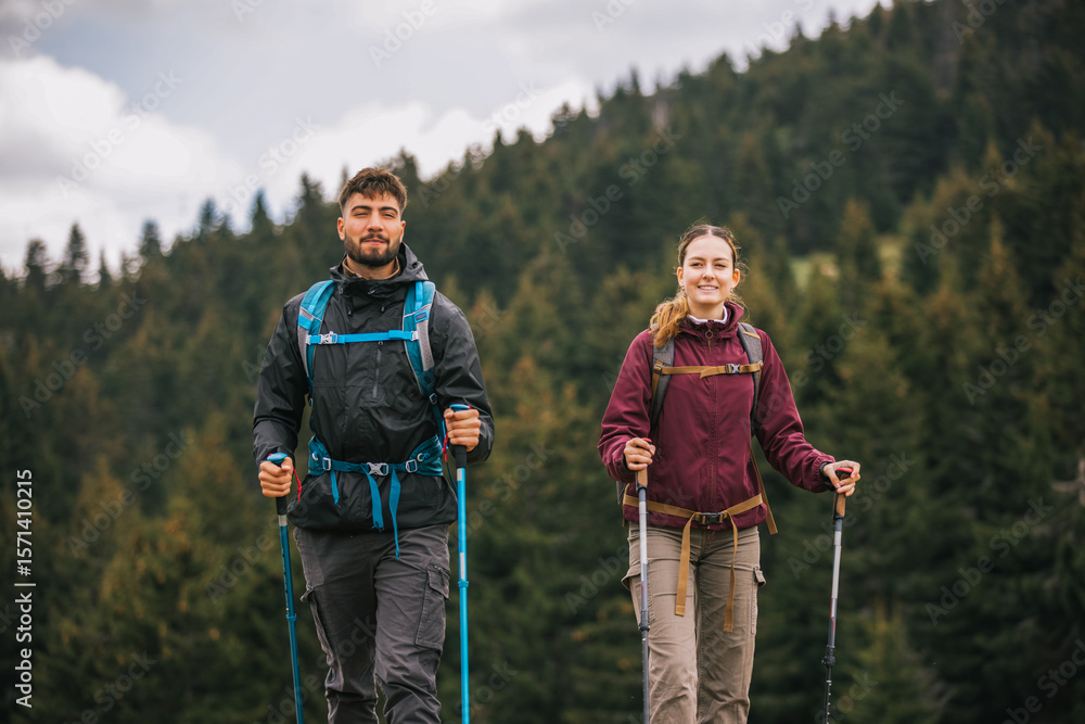 Young Couple Hiking in the Mountains Admiring Nature with Full Gear