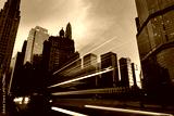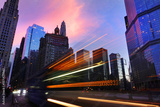 Chicago Skyline of Buildings with Sunset and Car Traffic Driving By on Michigan Avenue