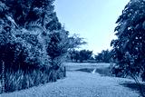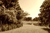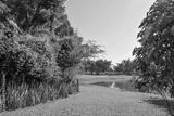 Tropical Garden with Pond and Greenery under Clear Blue Sky