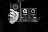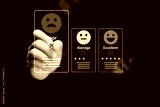 A person selects a "Poor" rating with a red sad face on a digital feedback interface, with options for Average and Excellent ratings beside it.