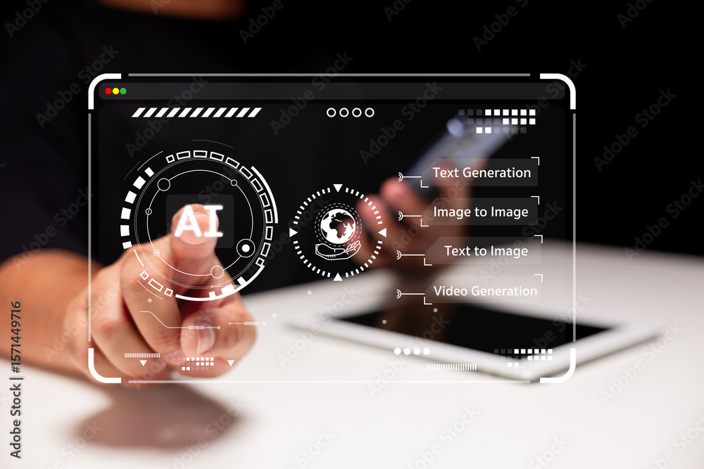 A hand interacts with a futuristic digital interface displaying AI-driven content creation options like text, image, and video generation.