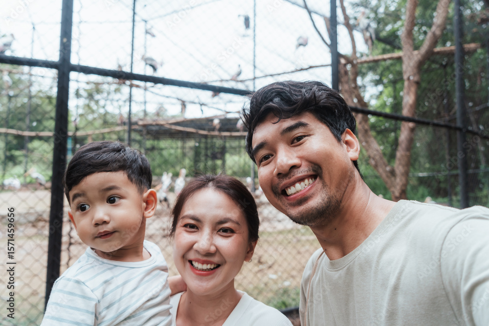 Happy Asian family taking selfie at the zoo with toddler. Smiling parents and child enjoying outdoor trip. Real life travel moment, family bonding, parenting, and wildlife experience background