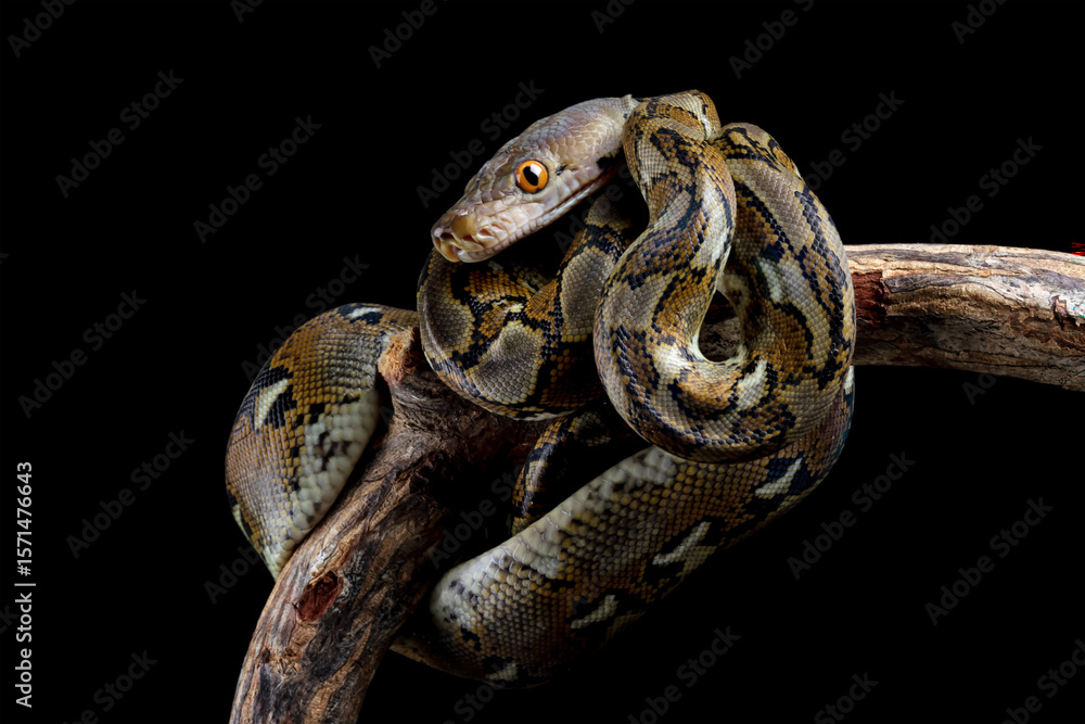 python reticulatus isolated on black background, non-venomous snake, ular sanca kembang