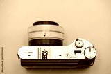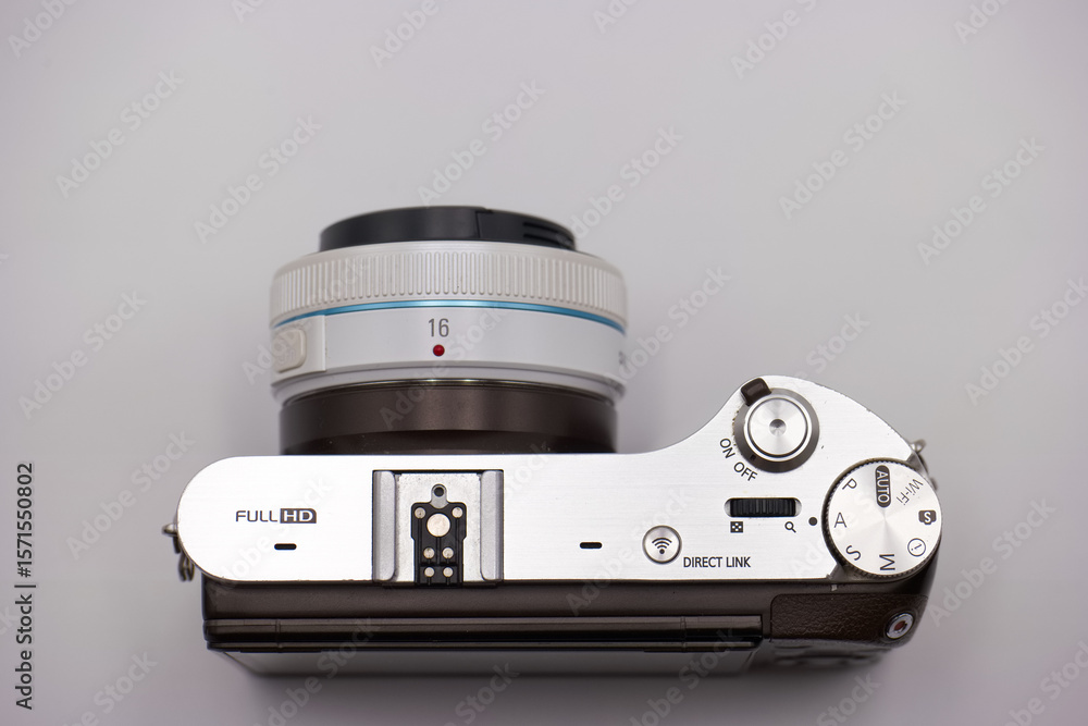 Camera with modern design showcasing control settings and lens details on a neutral background