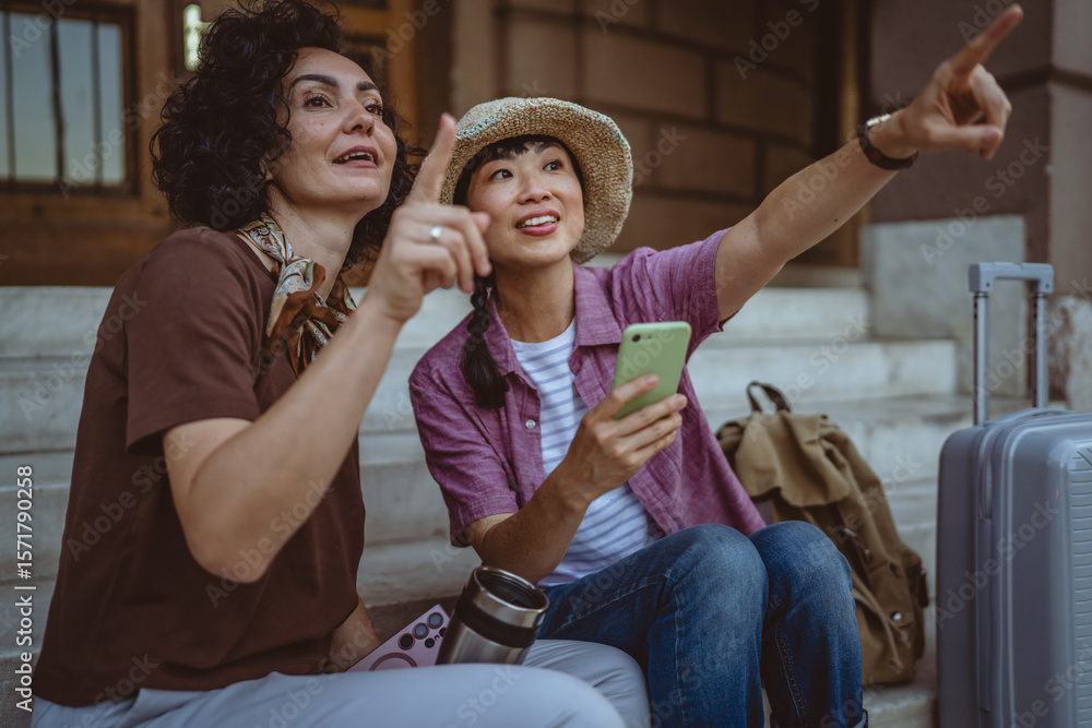 female tourist use mobile phone for directions while sit on staircase