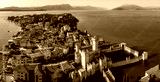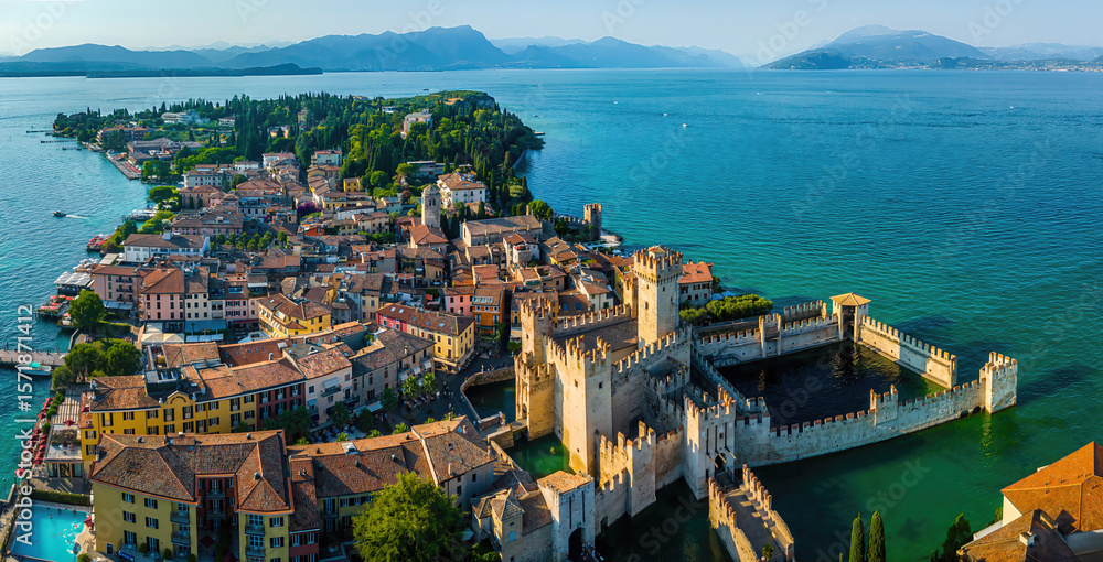 Aerial view of Sirmione, Italy, with boats, historic Scaliger Castle, waterfront promenade, and Lake Garda surrounded by mountains