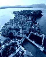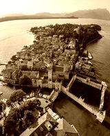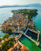 Aerial view of Sirmione, Italy, with boats, historic Scaliger Castle, waterfront promenade, and Lake Garda surrounded by mountains