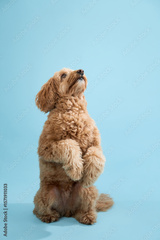 A Labradoodle with curly fur stands on its hind legs, looking curious against a light blue background.