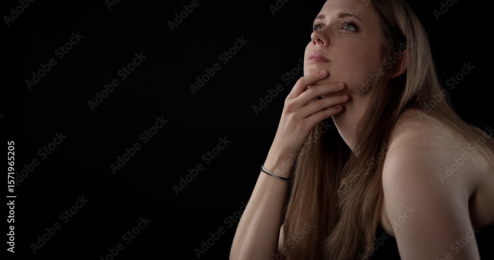 Thoughtful young woman is holding her chin and looking up on a dark background