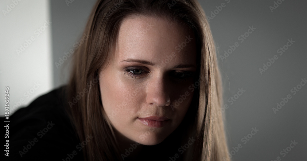 Portrait of a sad woman looking down with crying eyes, suffering from loneliness and depression