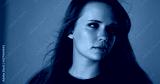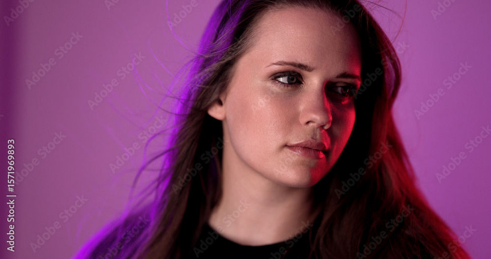 Model posing with purple and red neon lights for a fashion or beauty campaign