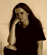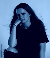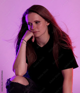 Studio portrait of a young woman with blowing hair, illuminated by colorful lights, creating a vibrant and stylish atmosphere