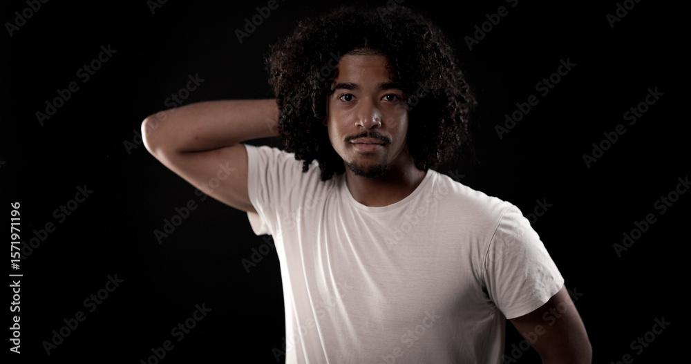 Studio portrait of a young african american man with hand on his head, wearing white t shirt, posing on black background
