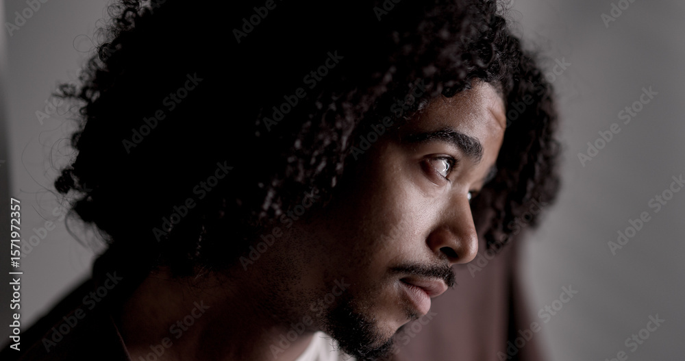 Close up portrait of a thoughtful young african american man with curly hair looking away with hope