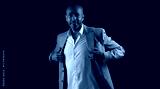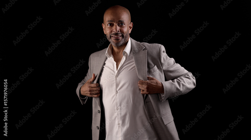 Portrait of a smiling african american businessman showing his white shirt and opening his elegant jacket on black background