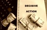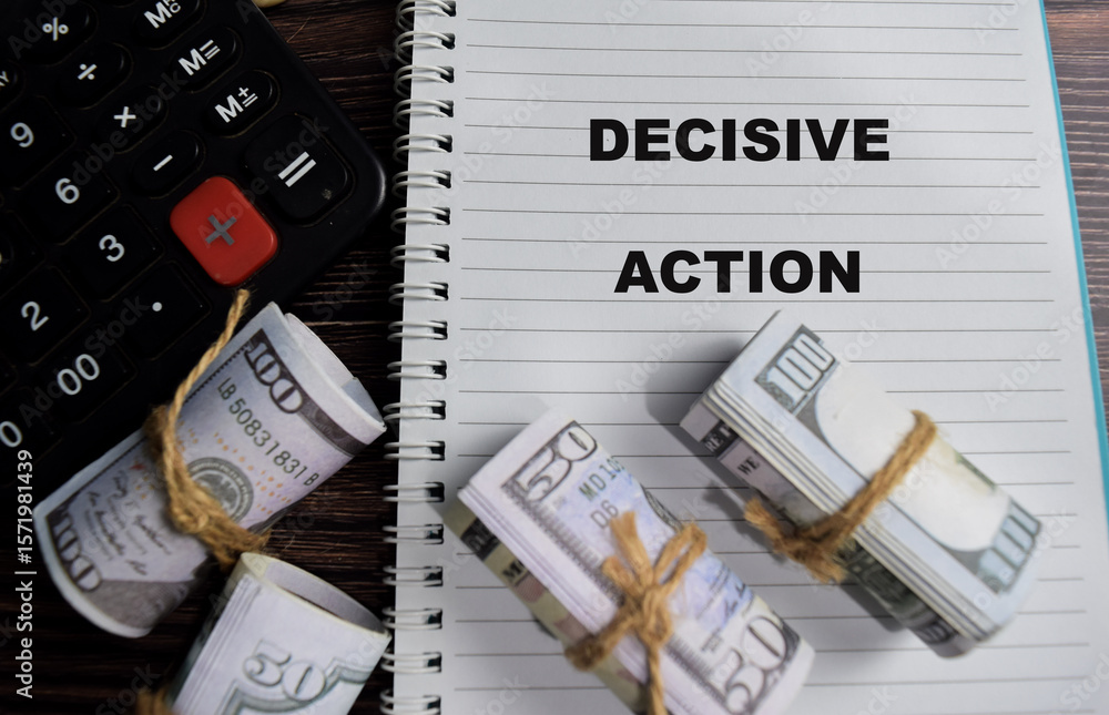 Concept of decisive action write on book isolated on Wooden Table.