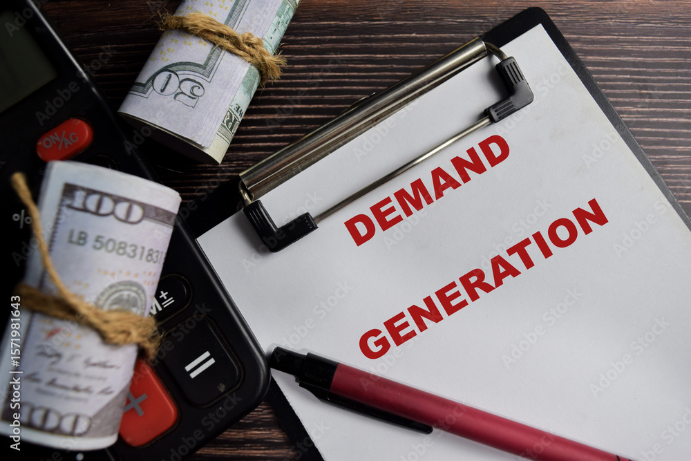 Concept of demand generation write on clipboard isolated on Wooden Table.