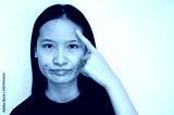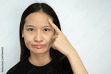 Portrait of young Asian woman pointing to acne problems on her face.