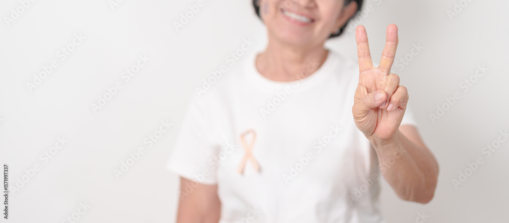 Elderly woman with Peach Ribbon for September Uterine Cancer Awareness month, Endometrial Cancer, Gynecologic, Uterus and Ovaries, Endometriosis, June Vaginal cancer and World cancer day concept