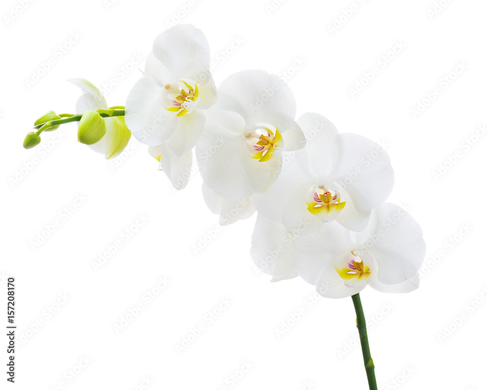Delicate orchid branch blossoming with large white flowers isolated on white background. Blooming twig of Phalaenopsis orchid flower.