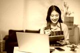 Young Asian woman entrepreneur taking notes on a clipboard while managing her online business from a home office, surrounded by cardboard boxes and demonstrating efficiency