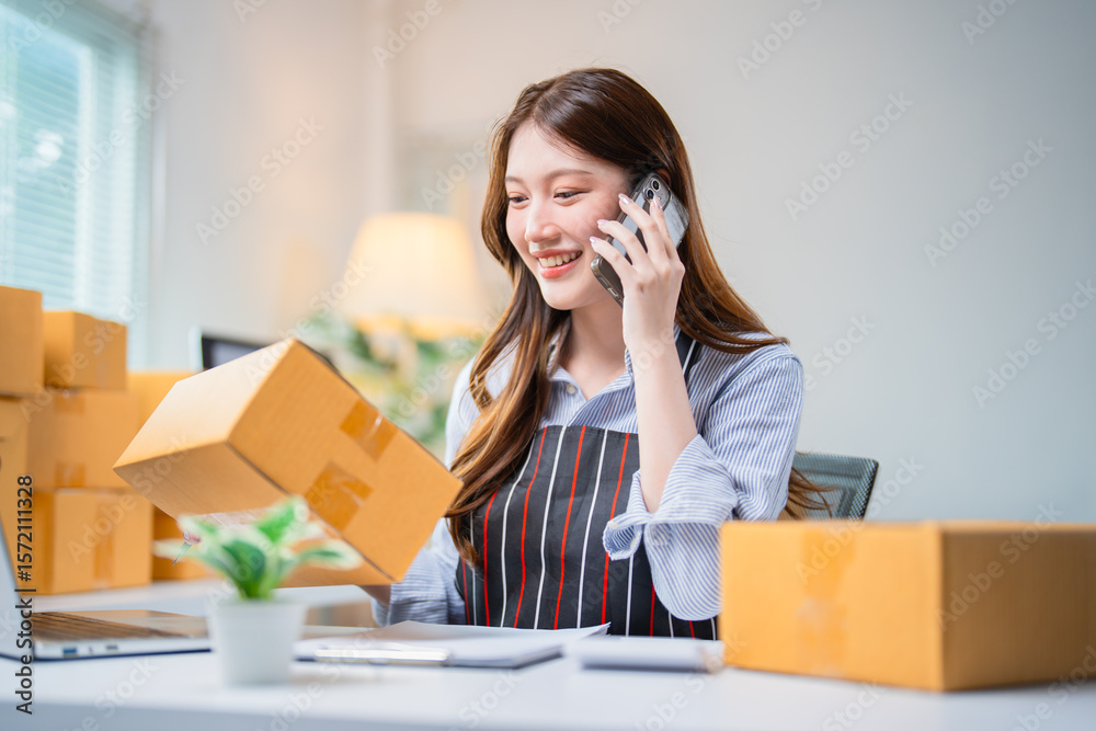 Young asian woman entrepreneur, small business owner, startup online seller using smartphone talking with customer confirming order and preparing packages for shipping at home office