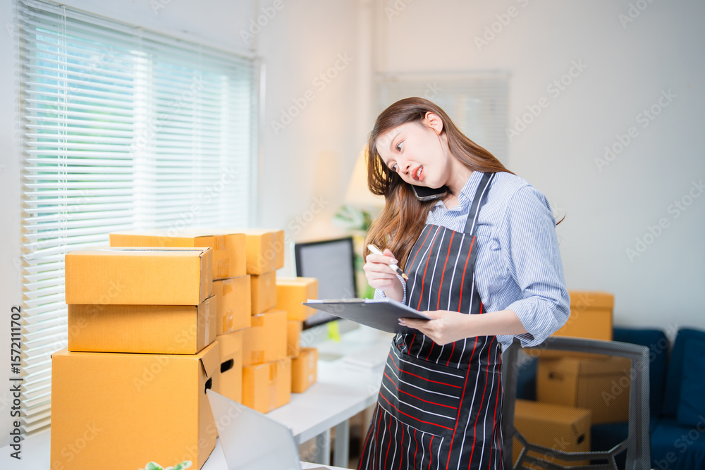 Young entrepreneur managing her online business, talking on the phone with customers and taking notes on a clipboard, surrounded by cardboard boxes ready for shipping in her home office