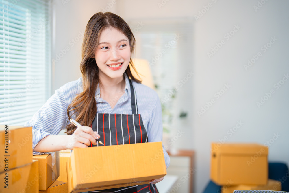 Young beautiful Asian woman entrepreneur wearing an apron and holding a pen, writing shipping addresses on cardboard boxes while preparing parcels for delivery in a home office