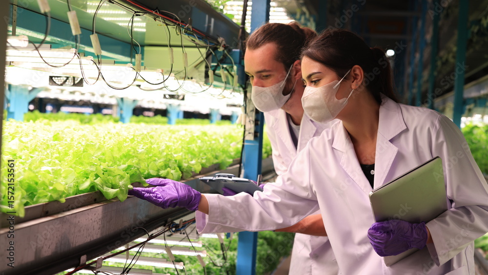 Botanist scientist woman and man in white lab coat work together on experimental plant plots biological researchers hold chemical test tube do science experiment with plant in greenhouses labor