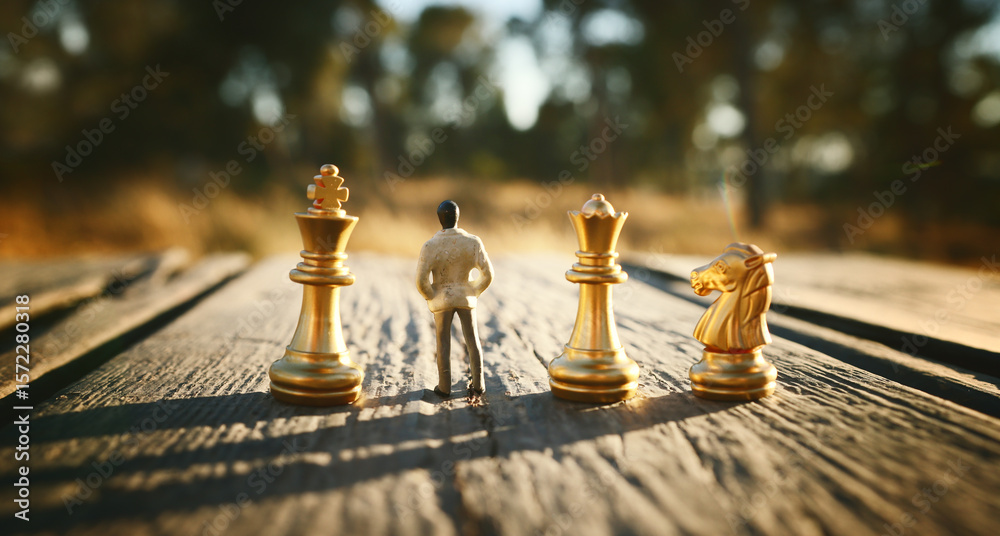 Image of chess pieces and miniature figure. Business, competition, strategy, leadership, and success concept