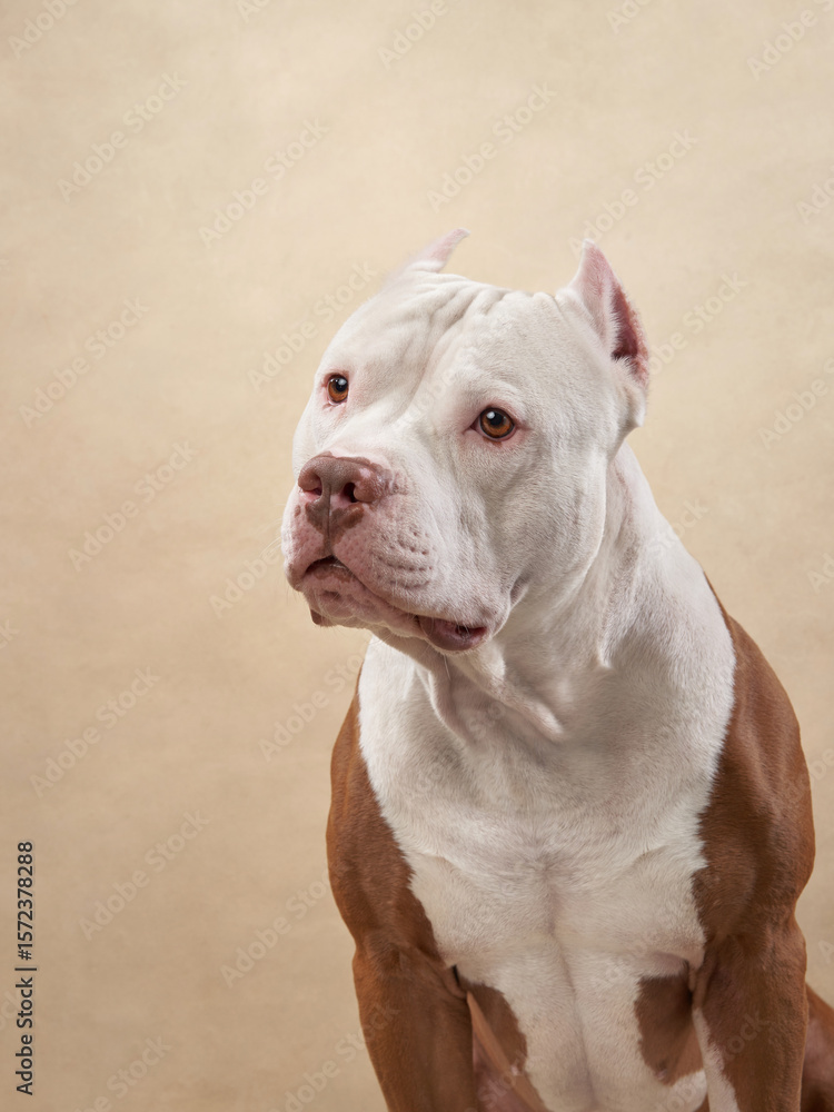 A Pitbull's profile is captured as it sits calmly on a neutral studio background, showcasing its muscular build and poised demeanor. The clean composition highlights the dog's features.
