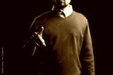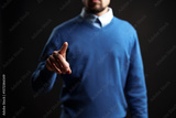 Man in blue sweater gestures confidently with a pointed finger against a dark background